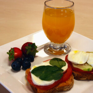 Tostadas con tomate, pepino y queso fresco y zumo de naranja natural