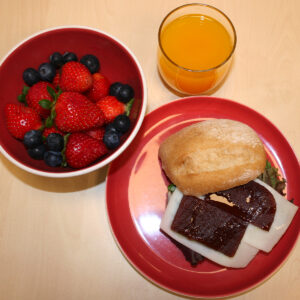 Bocadillo de Ciabatta Rústica Proceli con membrillo y queso, bol de frutas y arándanos y zumo de naranja natural