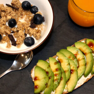 Rebanada de pan tradicional Proceli con aguacate, bol de yogurt, granola y arándanos y zumo de naranja natural