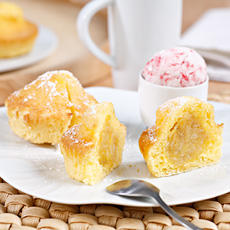 Open the gluten-free Muffins along the middle and fill them with the banana and coconut jam. Place 2 stuffed muffins on a plate, sprinkle with a little powdered sugar and accompany with the strawberry ice cream.