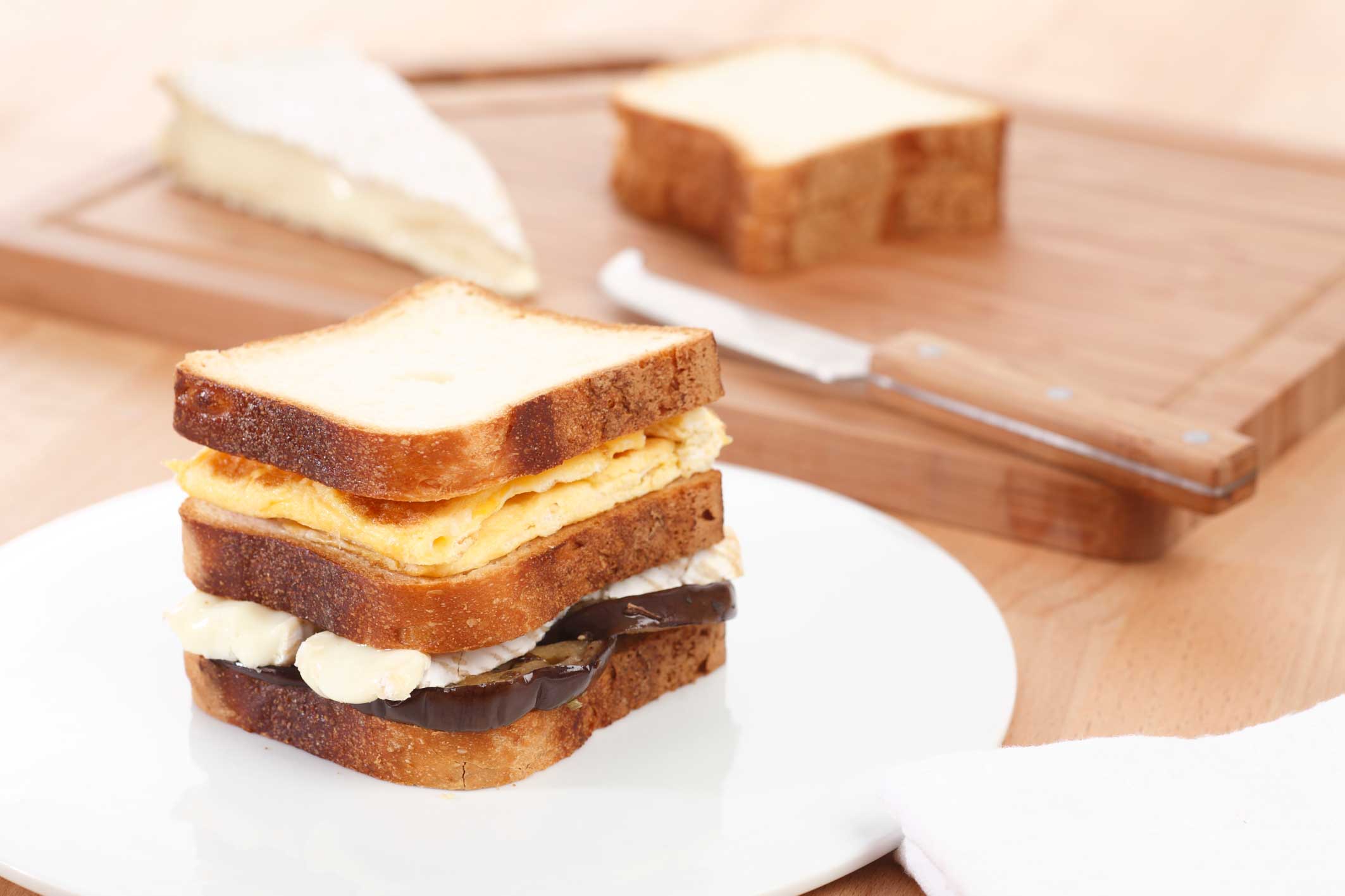 Heat the slices of gluten-free Sandwich bread for 15 seconds in the microwave at full power to eat as if fresh. Take a slice of Sandwich bread and place the aubergine and Brie cheese on top. Take another slice of Ideal bread and put the leak omelette on top. Finish with a slice of Sandwich bread. Heat in the microwave for 5 seconds and serve hot.
