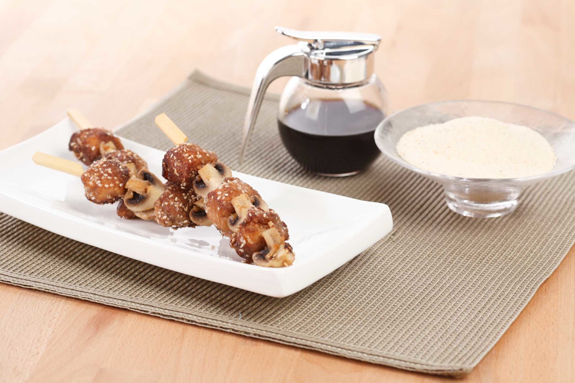 Cortar los champiñones en 4 trozos. Mezclar los 60 g de Pan Rallado sin gluten junto con el sésamo crudo. Rebozar los dados de pollo con la mezcla anterior y montar las brochetas alternando un trozo de pollo y uno de champiñón hasta terminar la brocheta (unos 3-4 trozos de cada). En una sartén, poner aceite de oliva y, cuando esté caliente, cocer las brochetas de pollo a fuego medio por todos los lados hasta que el pollo y los champiñones estén cocidos.